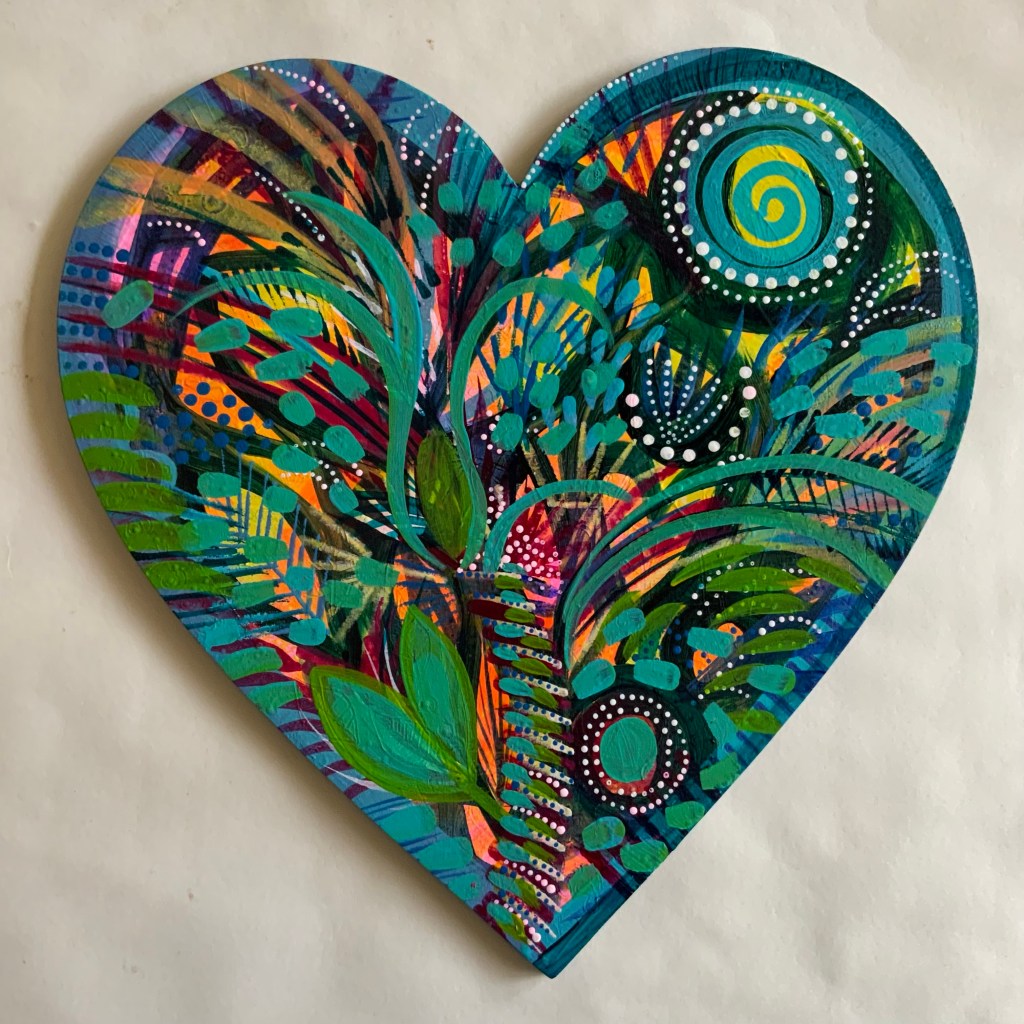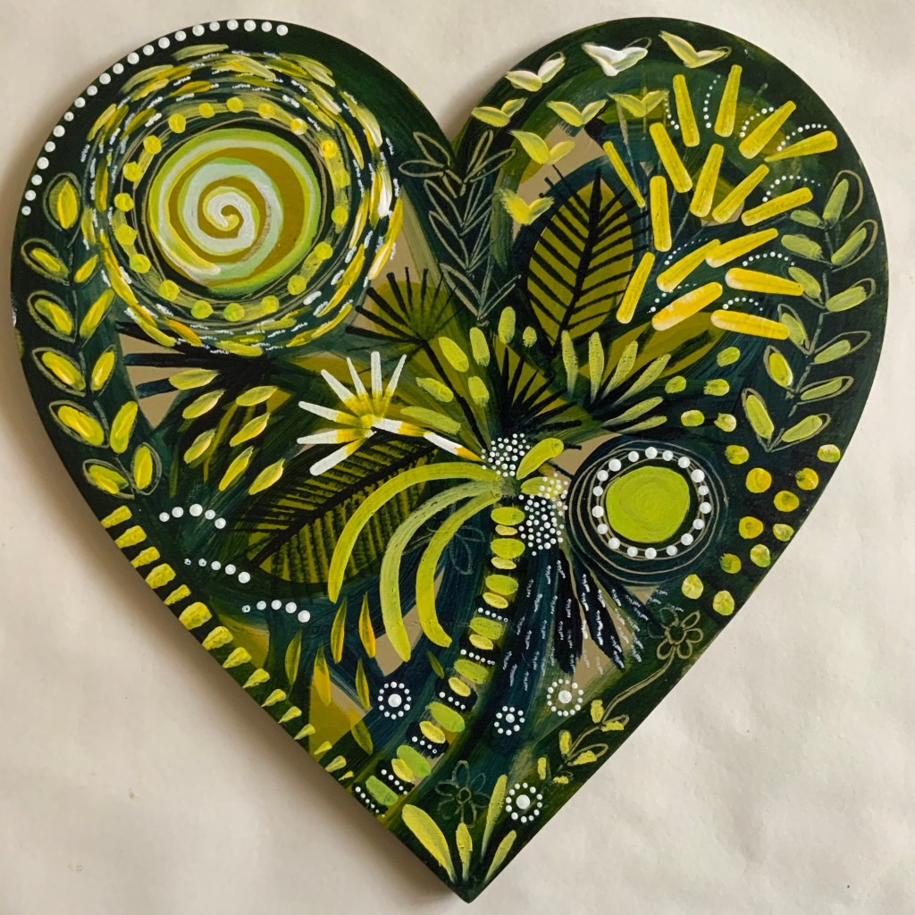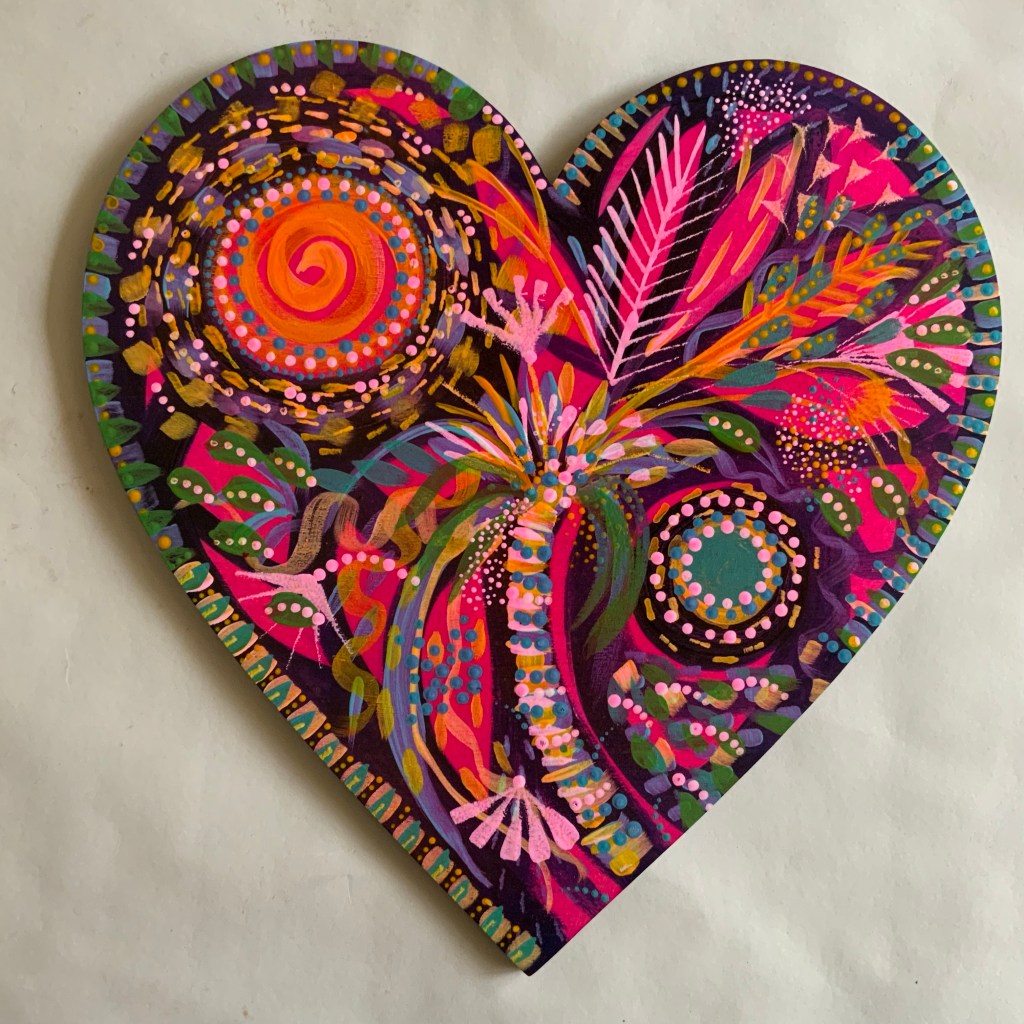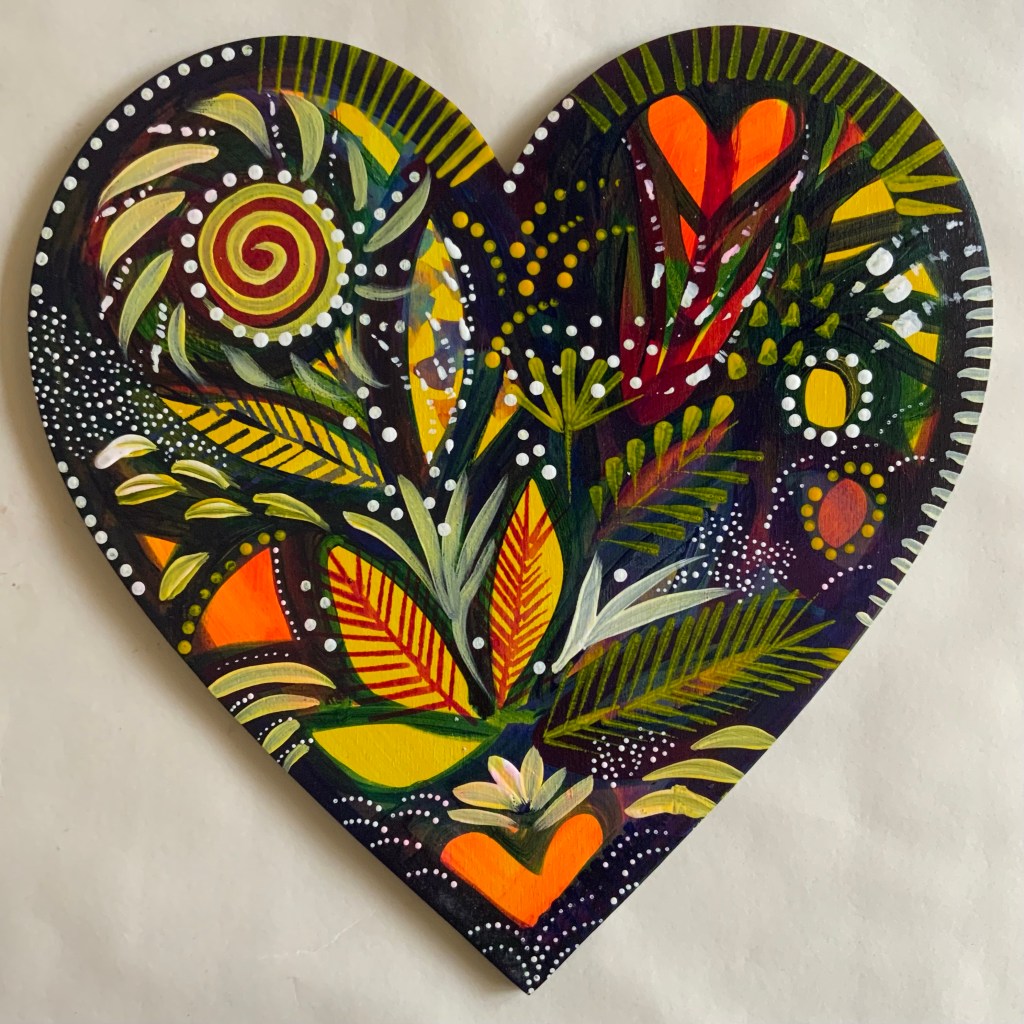 Each heart is painted using colourful acrylics onto a 6mm plywood heart shape measuring 30 cm x 30 cm at the widest/tallest part and finished with a protective coat of acrylic varnish.