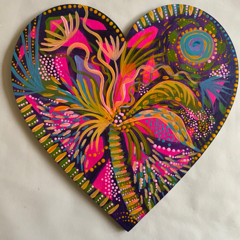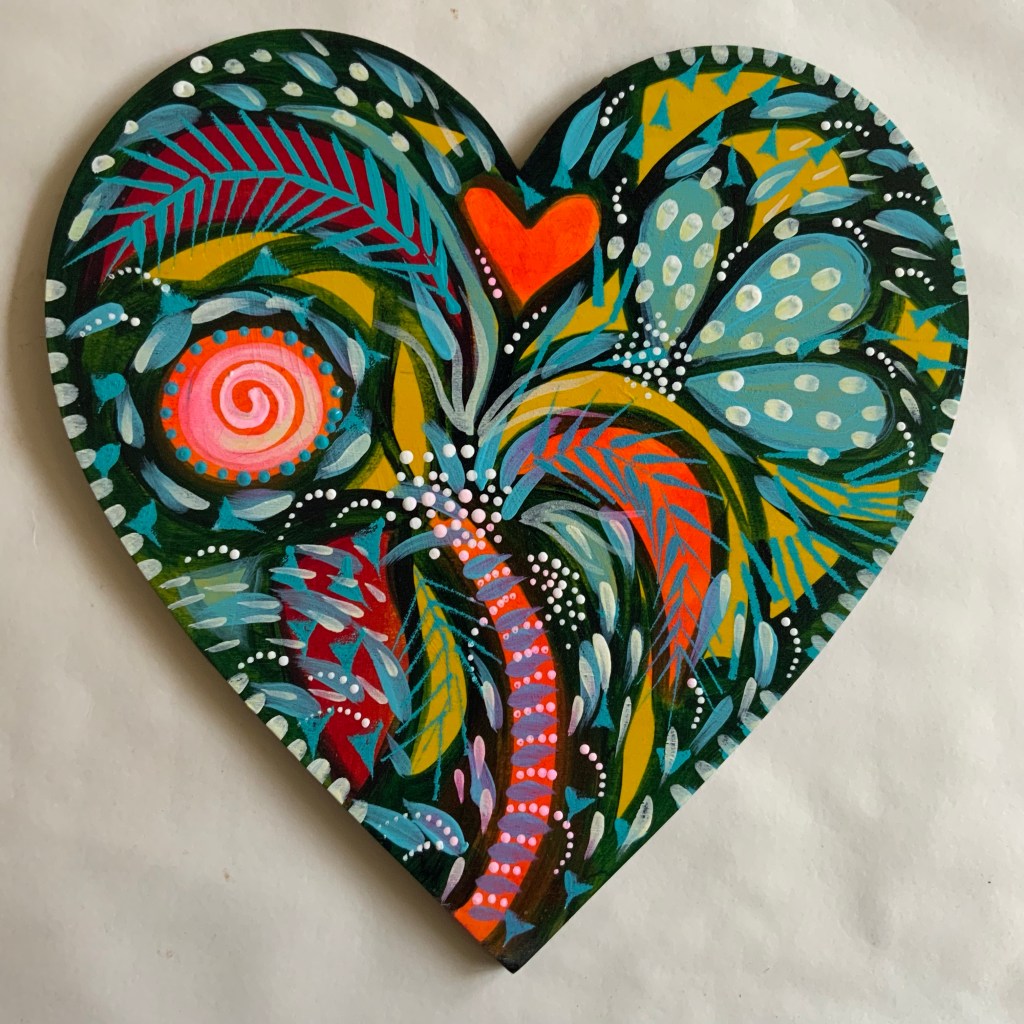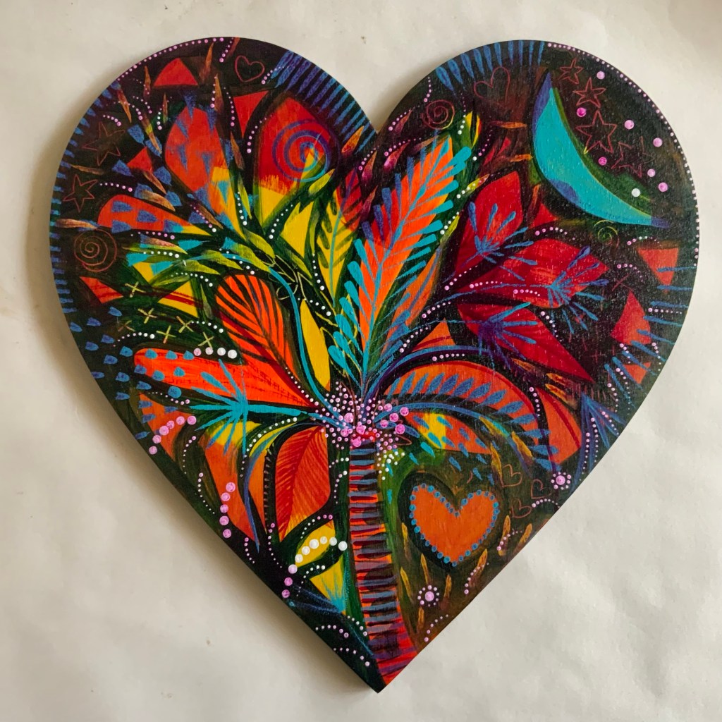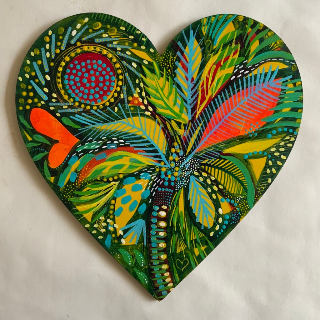 Colourful hearts painted in a folk art style featuring palms and abstract decorative imagery inspired by the natural world