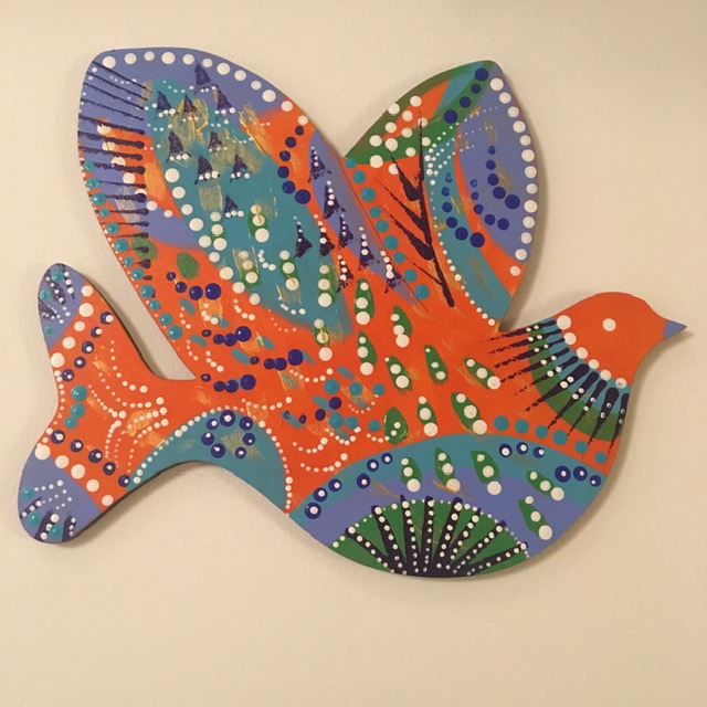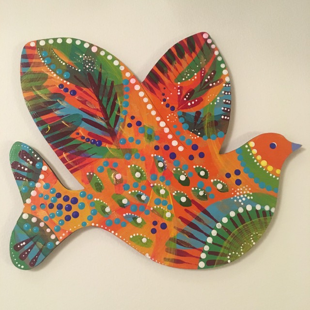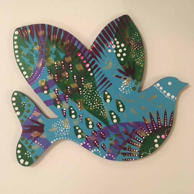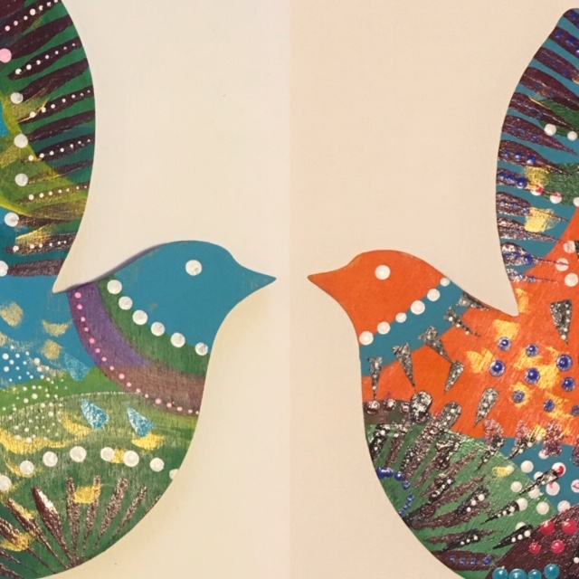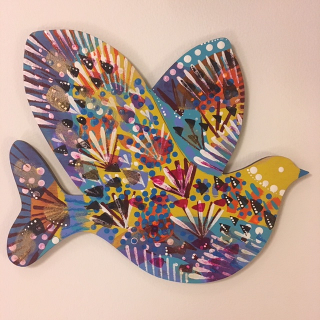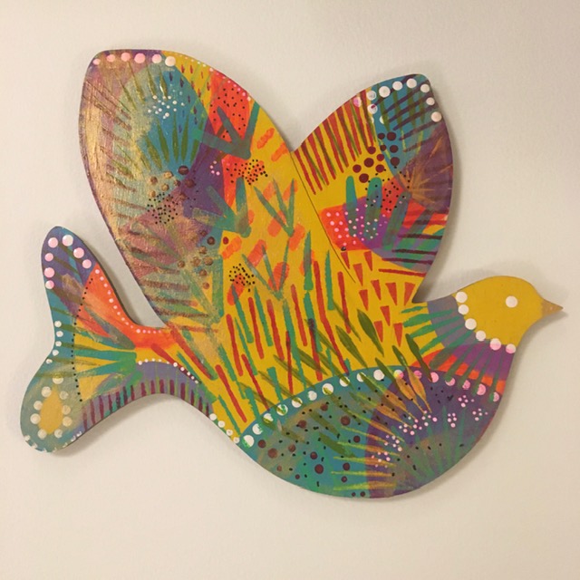 The birds are painted onto a laser cut template made of 6mm plywood to a unique design by me. The colourful birds are painted in my trademark intuitive style featuring interesting mark making and have a folk art feel to them. Many people have told me they remind them of both Mexican folk art and Aboriginal art.