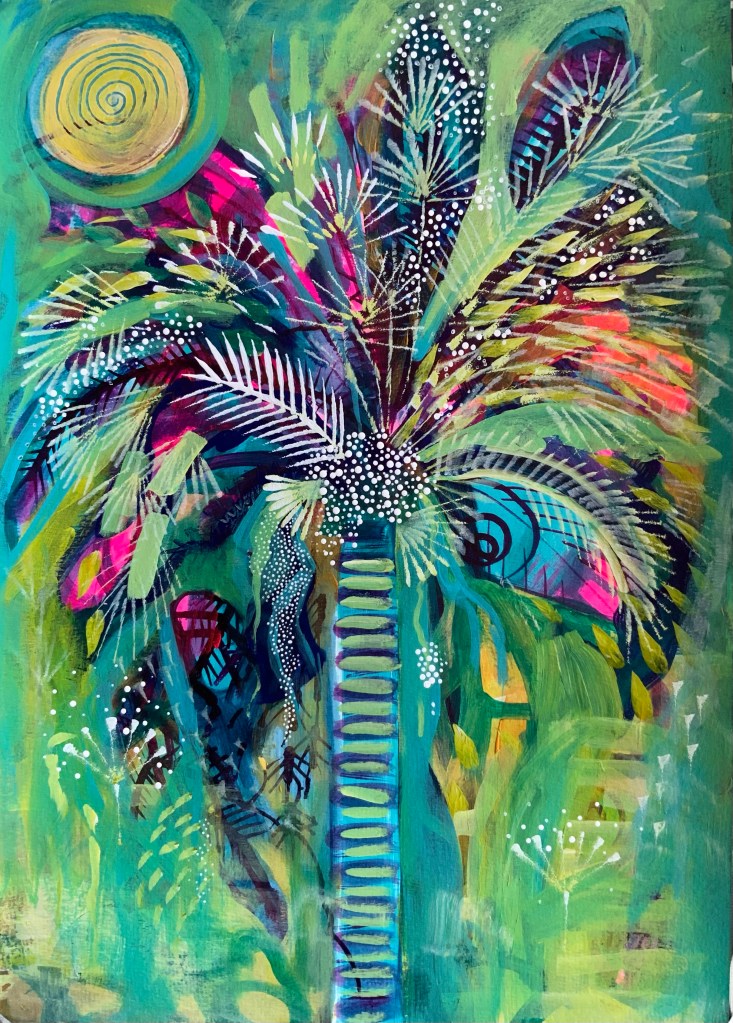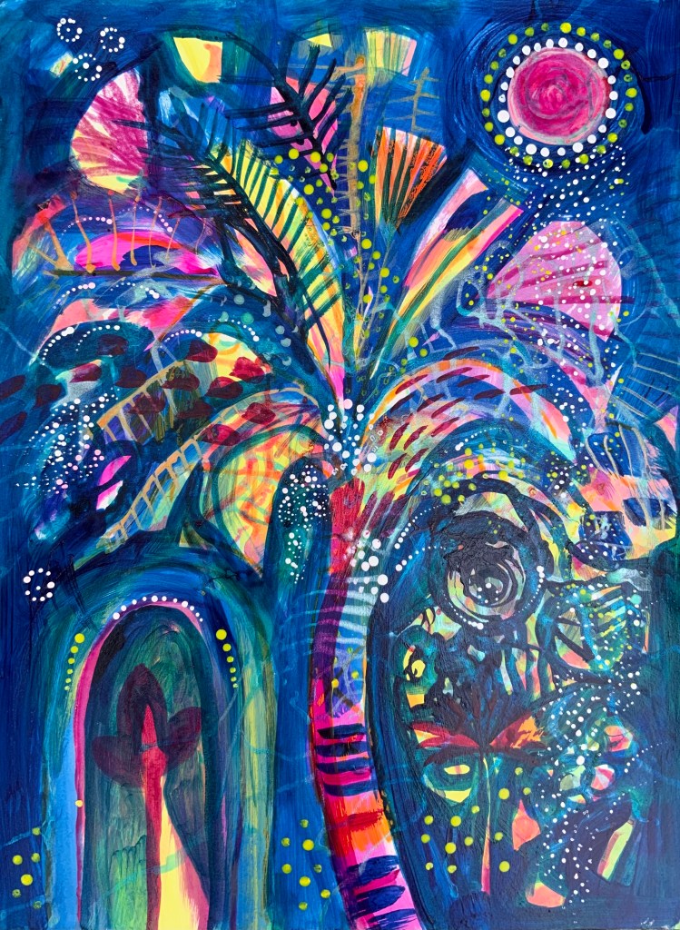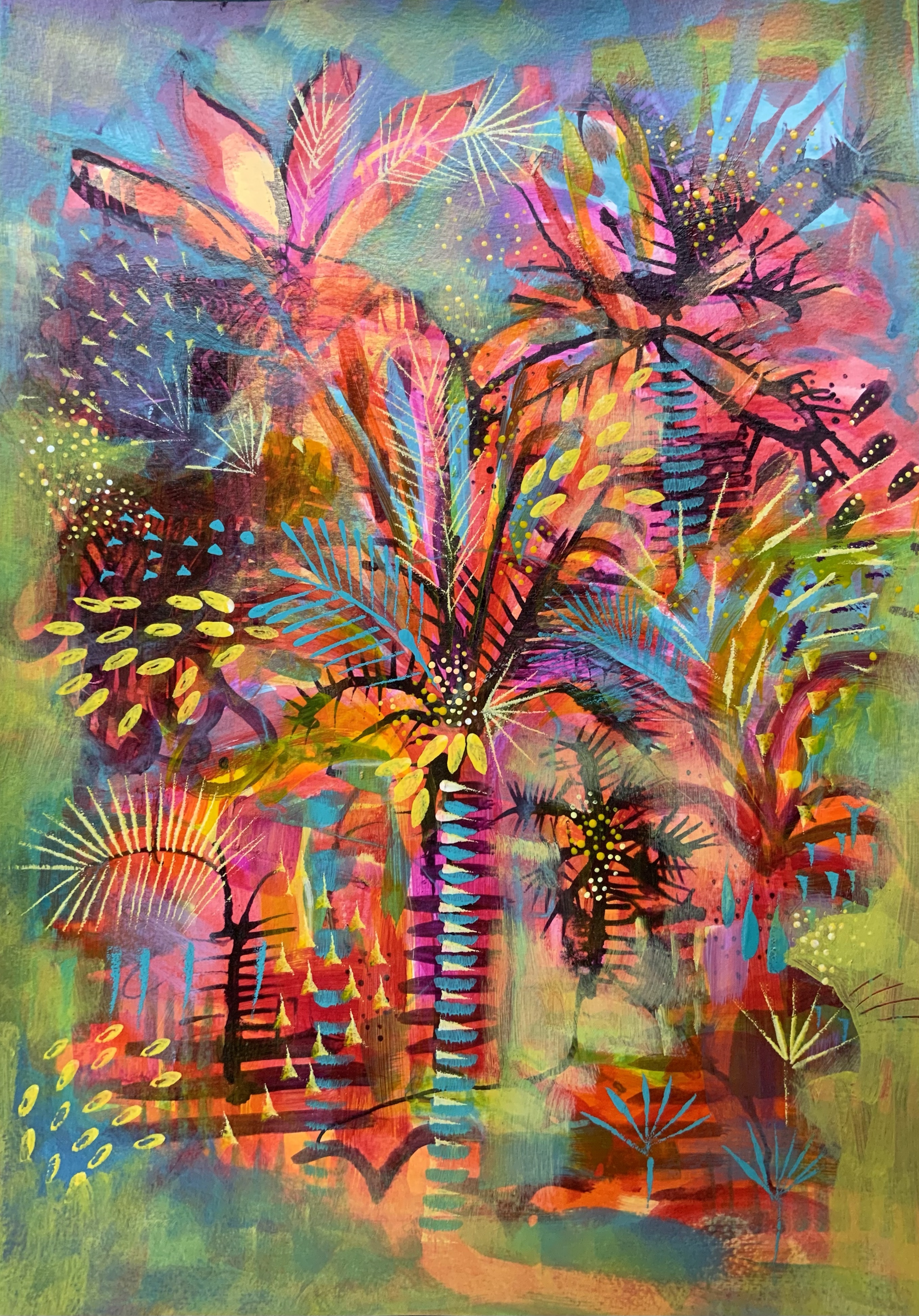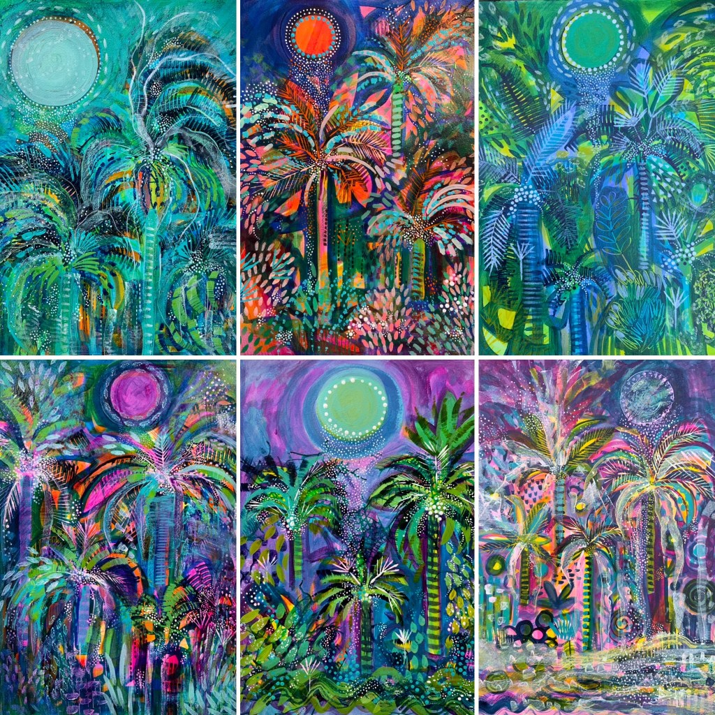 From February until May 2024 I painted one original painting each day. The collection includes a fabulous array of Palm Paintings, Imaginary Rainforests and a series of Palms and Portals.
